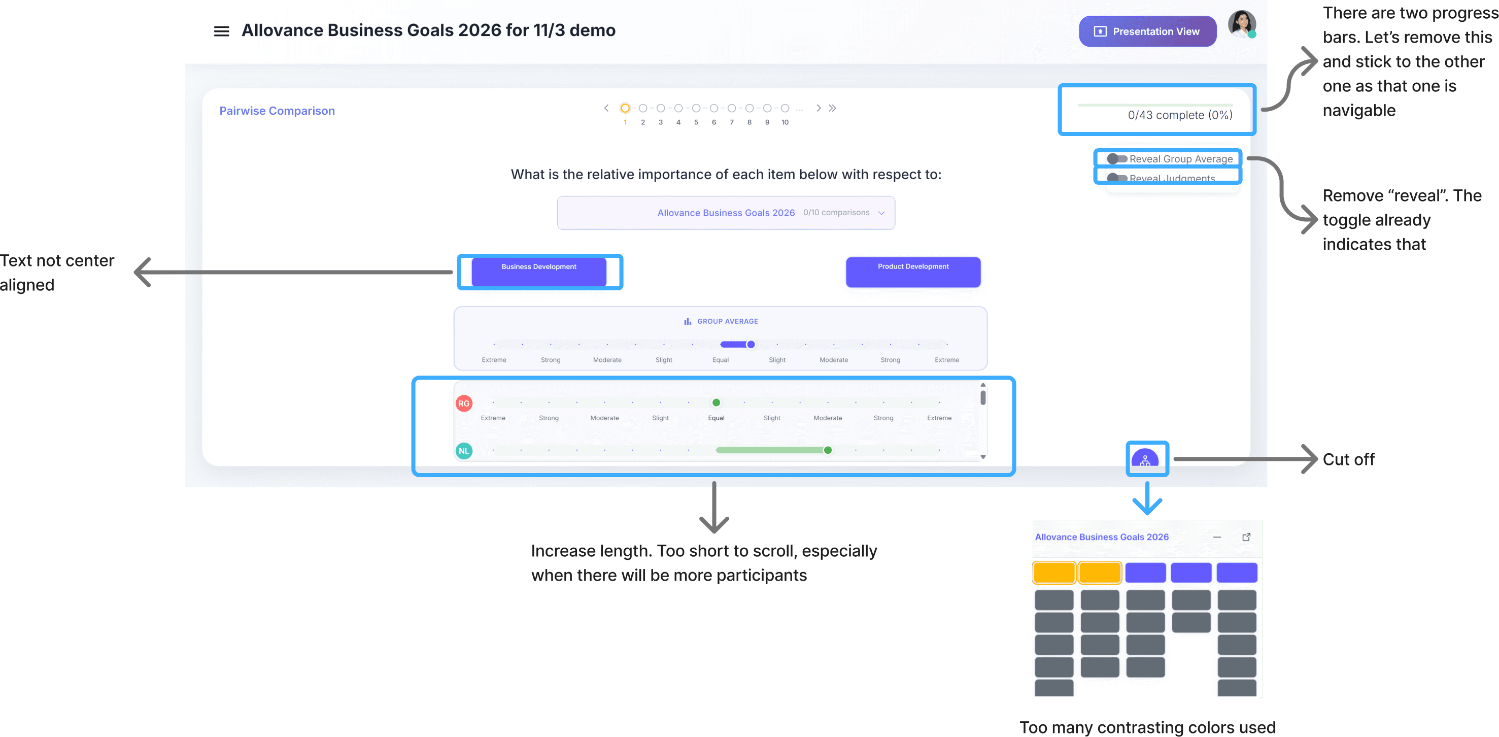 Certain UI elements (e.g., highlighted input fields or "Presentation View") draw disproportionate attention, distracting from more important tasks and disrupting user focus.