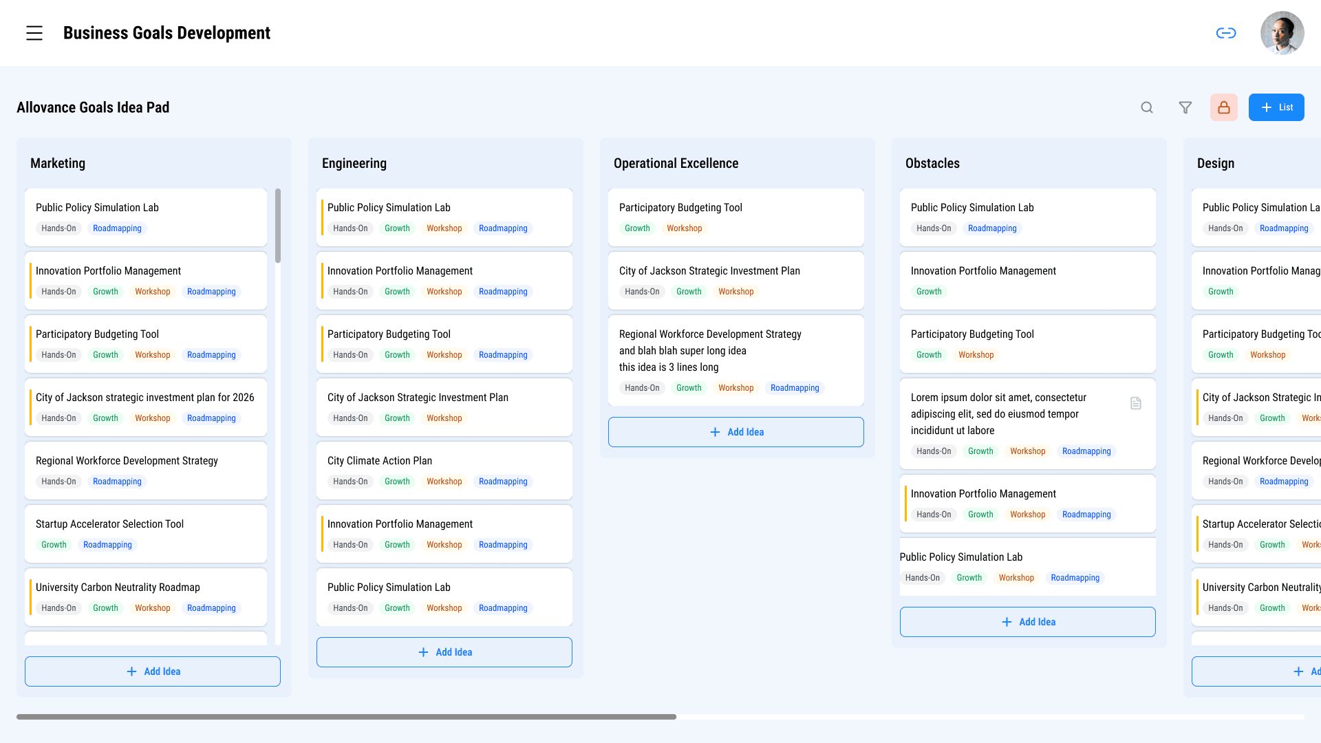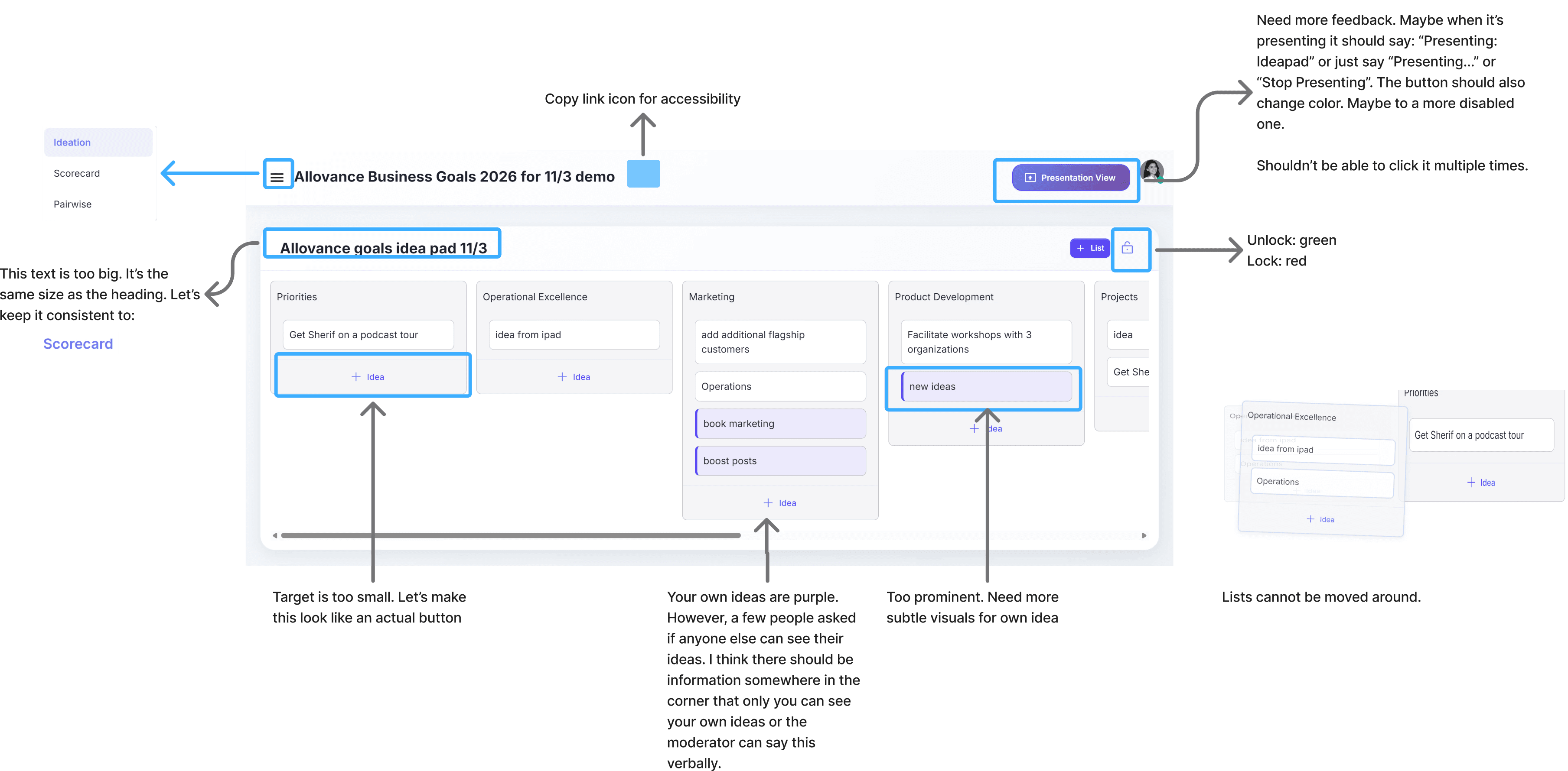 Interactive elements (e.g., “+ Idea”) do not clearly resemble actionable components, leading to uncertainty around what is clickable and how to interact with the system.